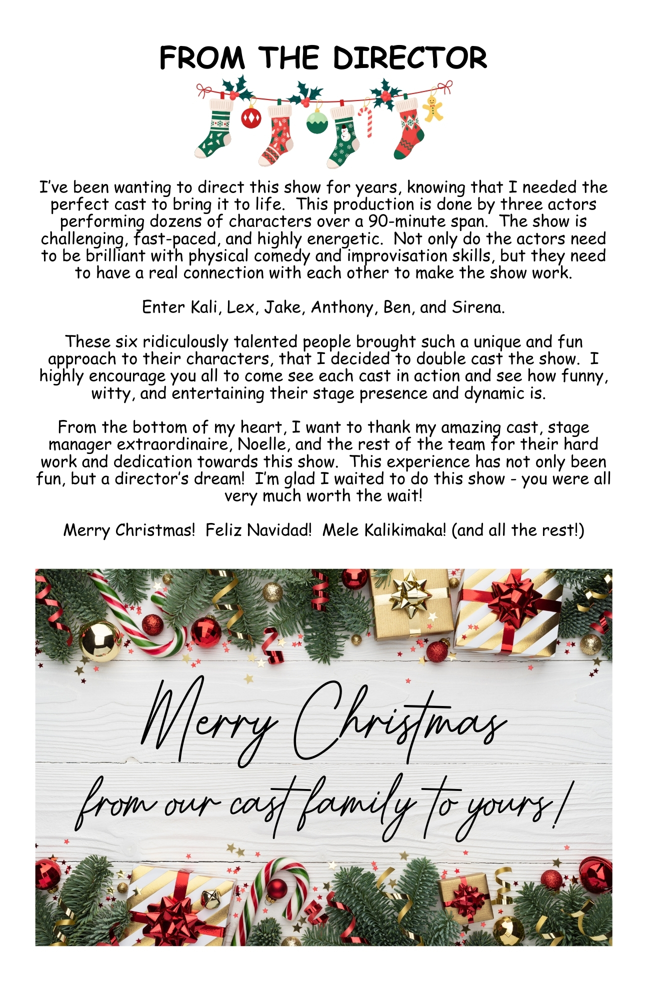 Santa Claus, Rudolph, the Grinch—and just about every other holiday character—make an appearance in this raucous comedy when three actors decide that rather than perform A Christmas Carol yet again, they’ll retell every Christmas story ever told in about 90 minutes! A madcap romp for the holiday season, this farce also features Christmas traditions from around the world, plus every carol ever sung! With Frosty, Charlie Brown and George Bailey making appearances, you’ll laugh yourself all the way to the New Year!