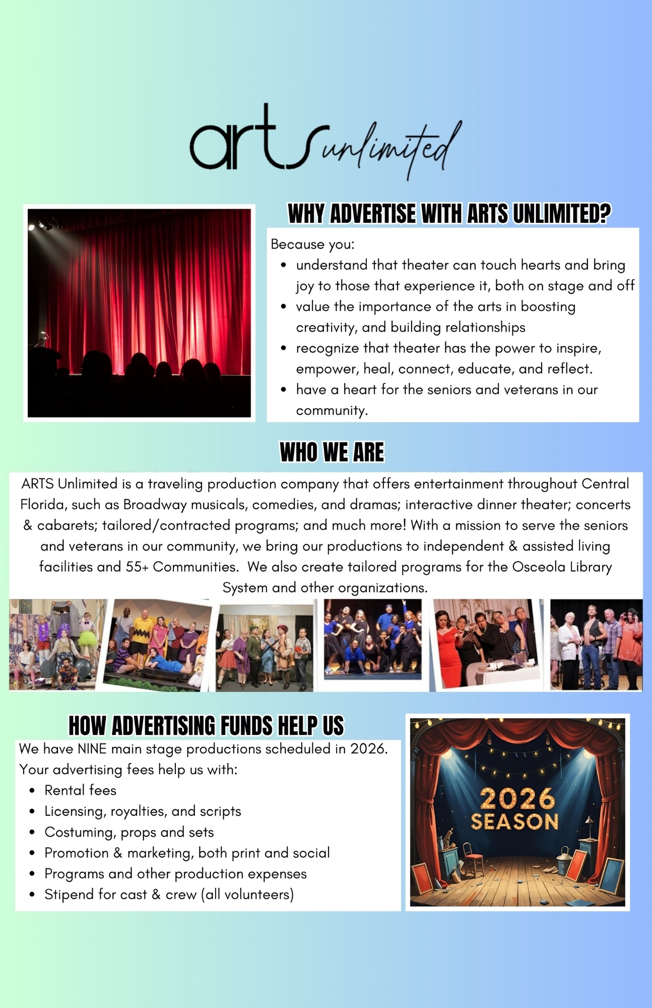 Send us a message to request more information about non-profit partnerships, advertising, auditioning, or volunteering.